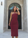 El escote tipo bandeau y la abertura trasera aportan un equilibrio perfecto entre sensualidad y clase