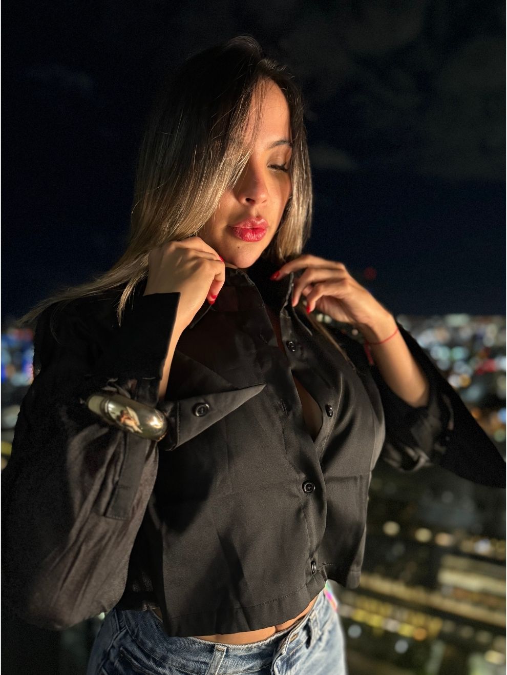Blusa corta en seda con mangas largas translúcidas y diseño contrastado que combina elegancia y frescura. Su estructura fluida realza la silueta con un acabado moderno y sofisticado, perfecta para elevar un look con denim o faldas de tiro alto.